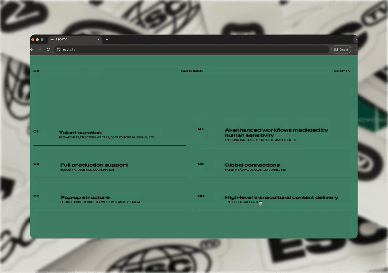 We designed and developed the ESC.TV website by unifying research, brand alignment, and a clear visual direction. Working alongside the brand designer, we brought the studio’s identity to the digital space through a dynamic and functional experience built in Framer.